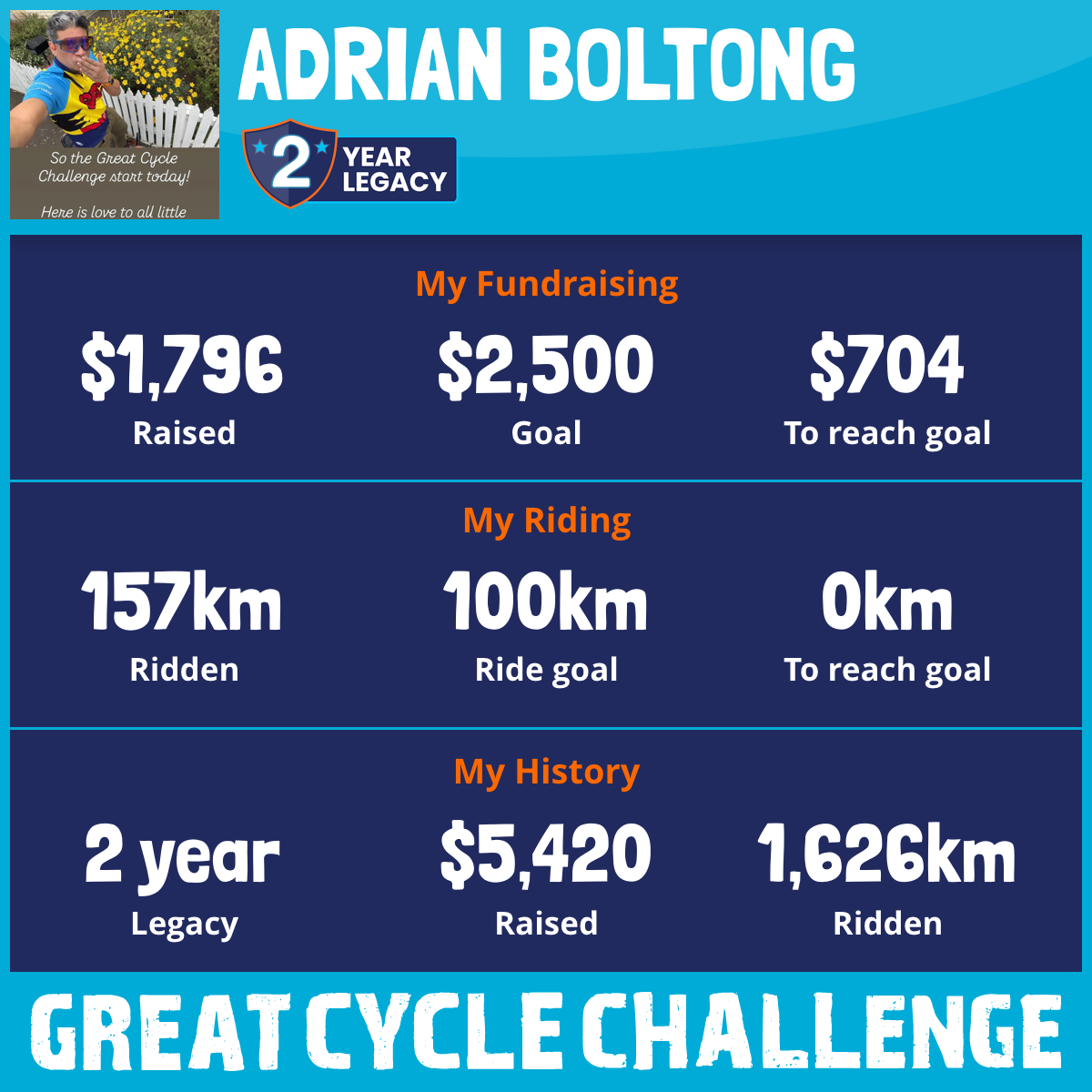 👉 https://greatcyclechallenge.com.au/Riders/AdrianBoltong