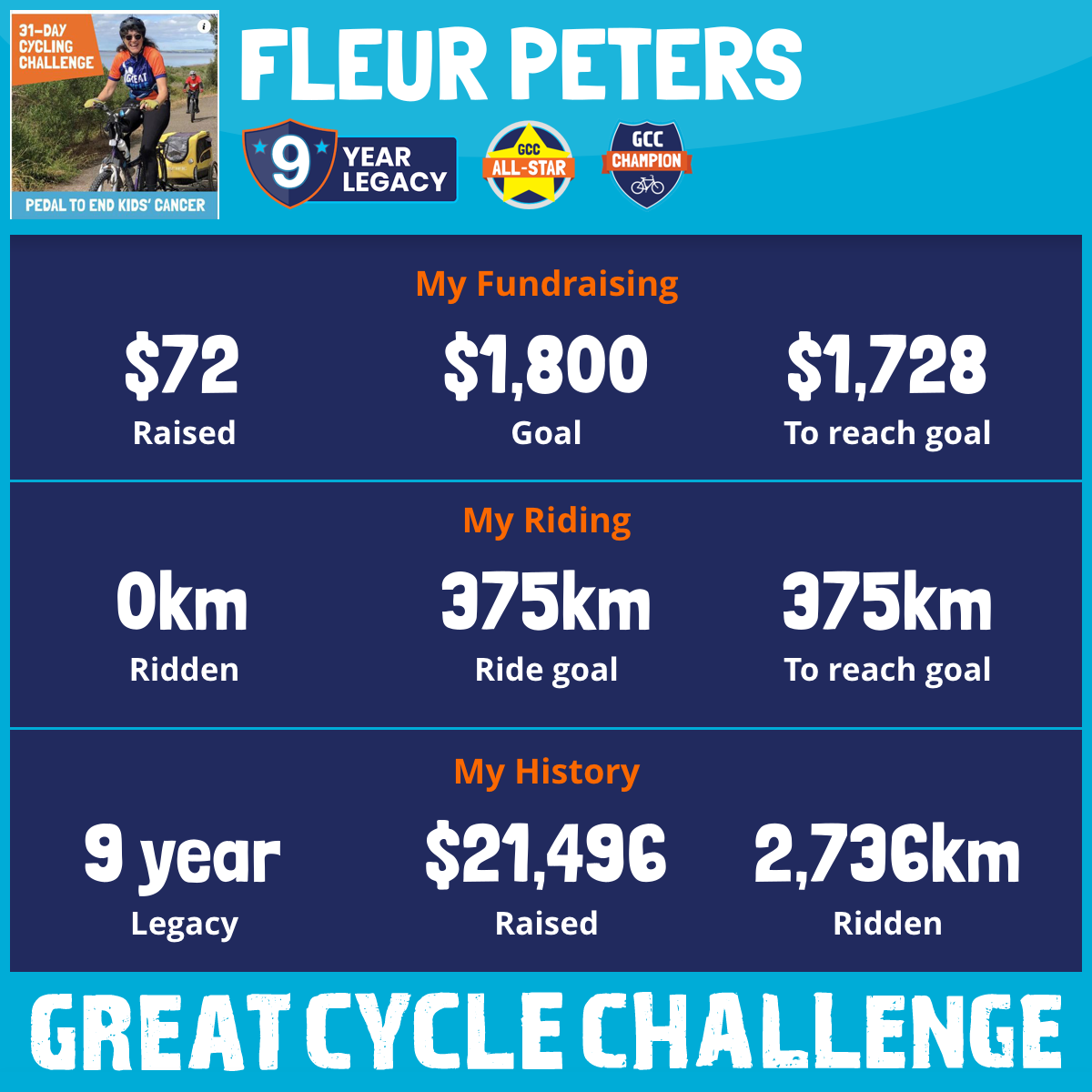 I've had some recent medical issues but nothing that is going to prevent me participating in this year's challenge. We've lost kids since we rode last year, and right now cancer is the largest single killer of children from disease in Australia – over 600 children are diagnosed with cancer every year and sadly, 3 die every week.