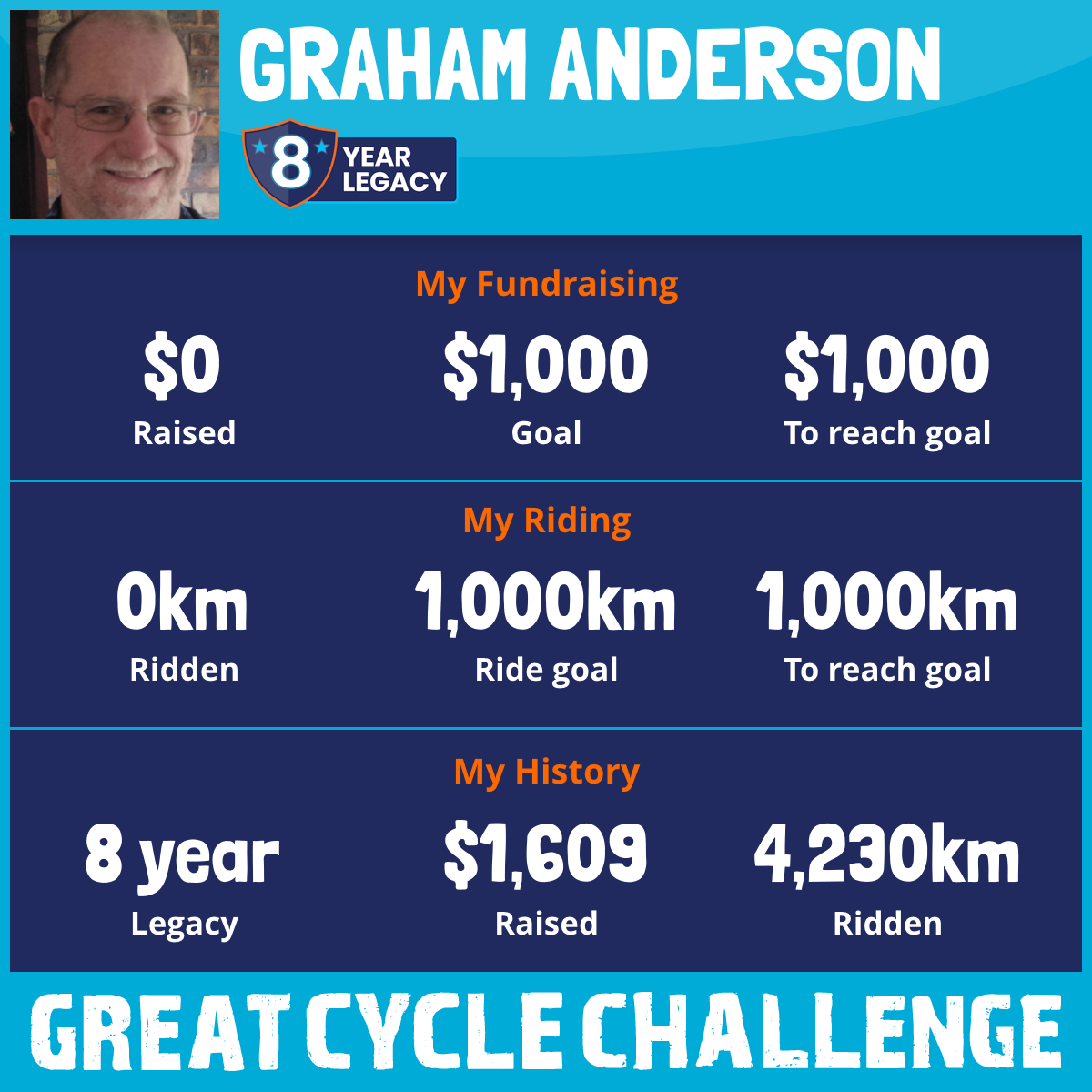 This is my 8th year in this Challenge - each year I try to do more than I did the previous year. This year my goal is to ride 1000 km, and to raise $1000 - with the added challenge - if - or when - my fundraising goes above $1000, I'll do an extra kilometre for every dollar above the target!