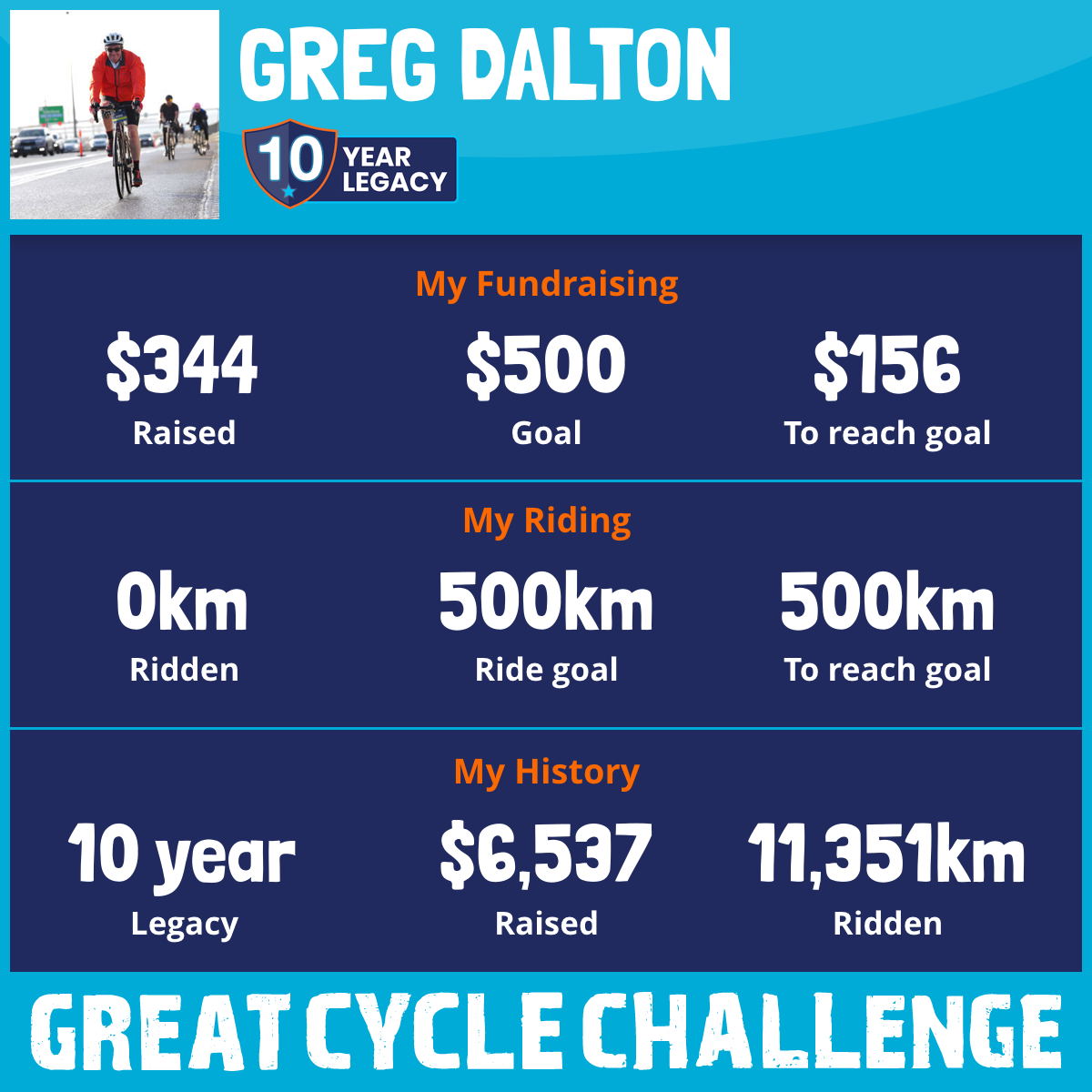 This October, I am again taking part in the Great Cycle Challenge to fight kids' cancer! This year is my tenth year of The Great Cycle Challenge. This year I am starting slowly as I am currently rehabilitating following total knee replacement in April. But I should achieve my cycling goal and my donation goal.