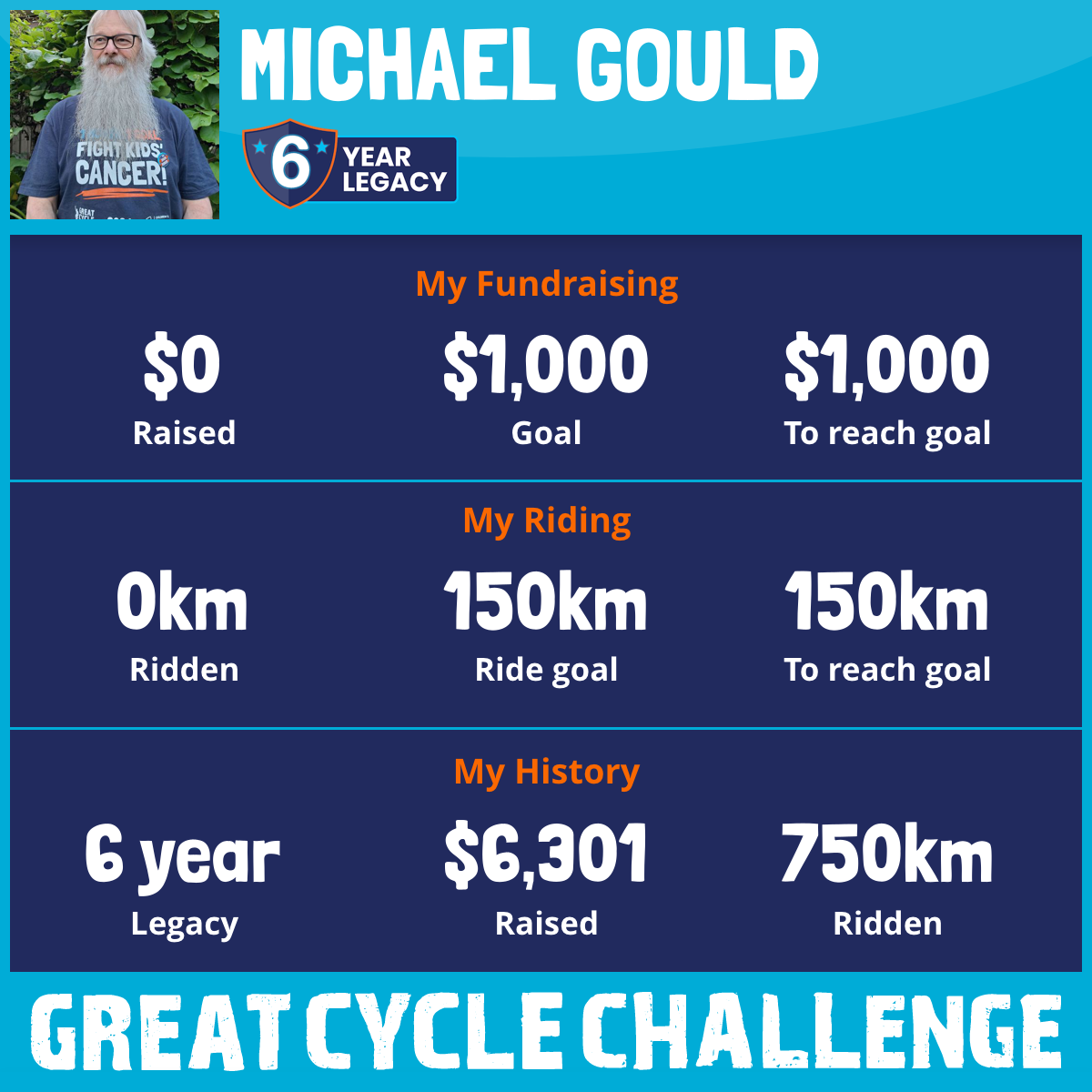 This year I'm challenging myself to ride 125km, the same last year and have set my fundraising target at $1,000.