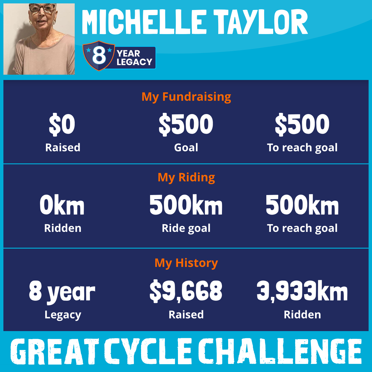 I am riding 500 km in memory of my sister, Susan Oconnor. Please sponsor me and support my challenge to fight kids' cancer and save little lives.