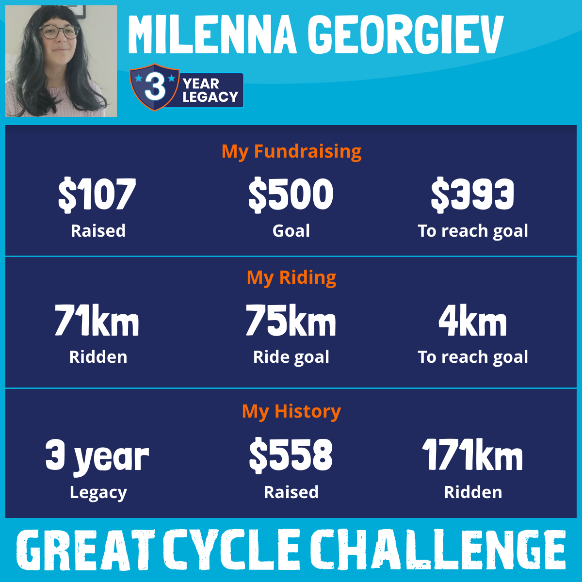 And so I am riding and raising funds to support the Children's Medical Research Institute to continue their work into the prevention, diagnosis, treatment and finding a cure for childhood cancer.