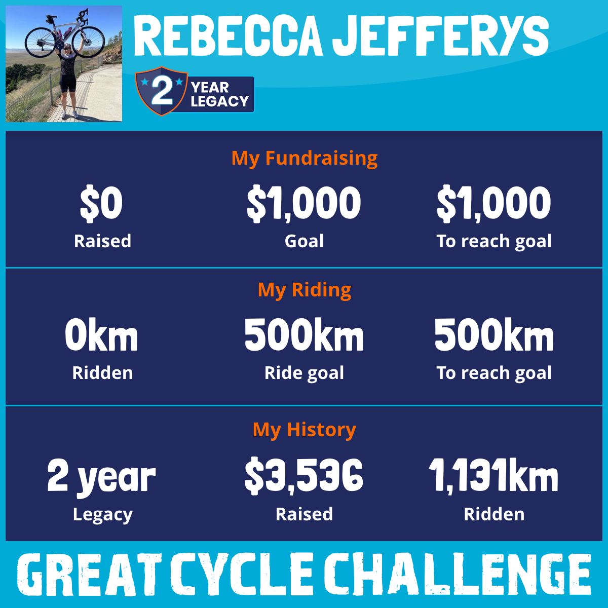 1,131 km Ridden$3,536 Raised2023