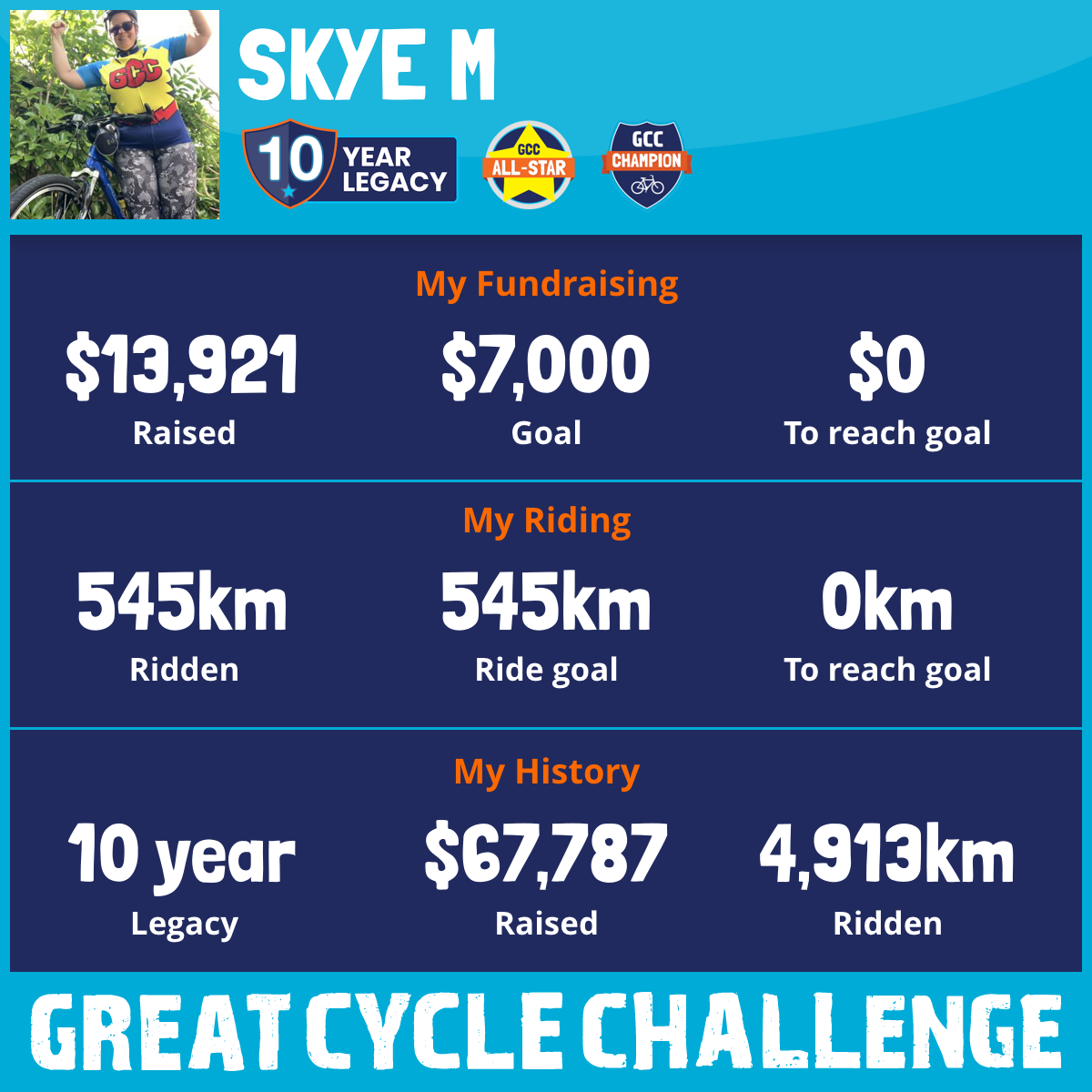 And so I am riding and raising funds to support the Children's Medical Research Institute to continue their work into the prevention, diagnosis, treatment and finding a cure for childhood cancer.