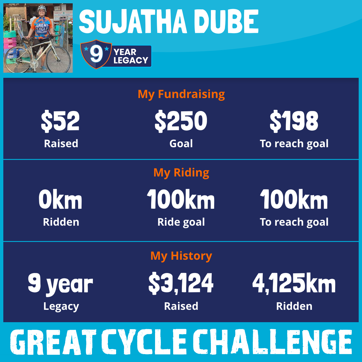 This October, I am taking part in the Great Cycle Challenge to fight kids' cancer! I've had some travel and backache issues so I am going to complete my riding goal only in November this year.