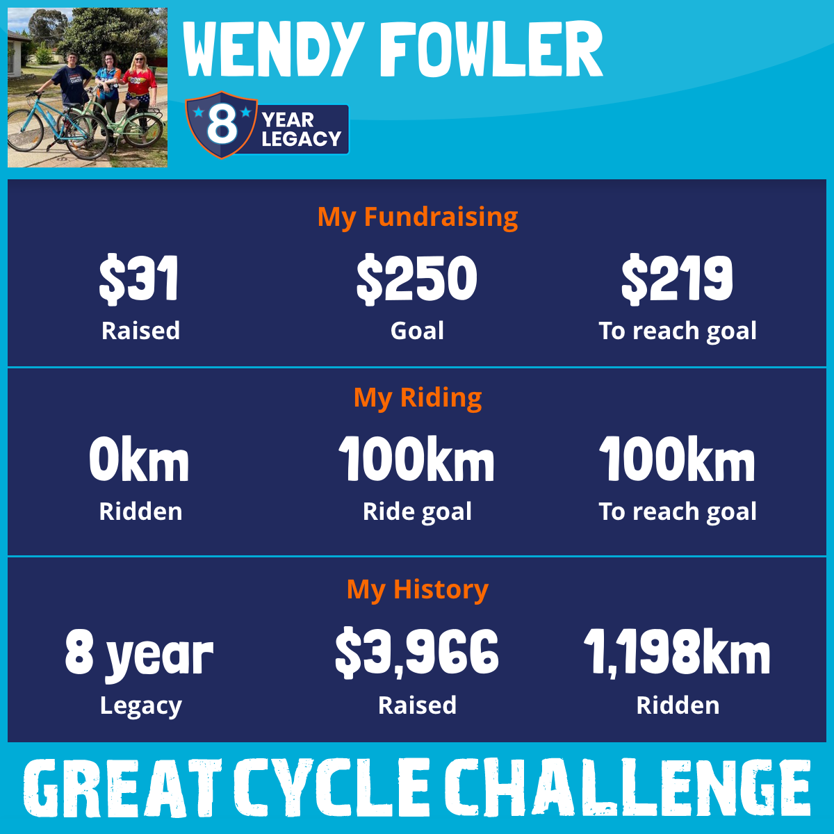 100 km Ridden$159 Raised2019