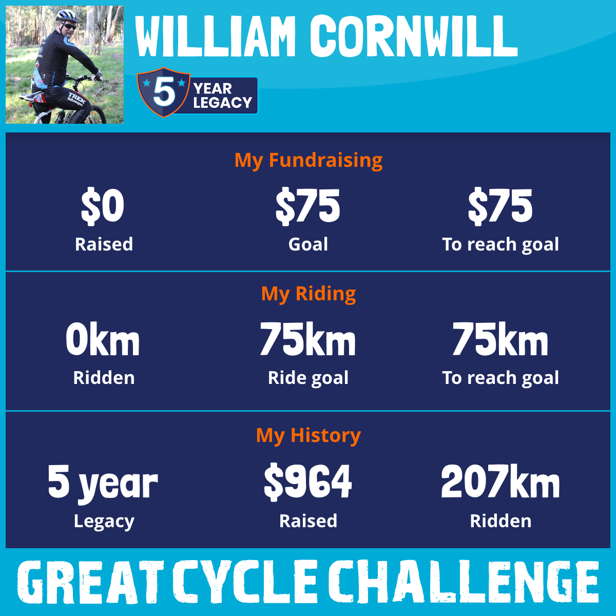I am riding 75 km in memory of my late father Richard Cornwill. Please sponsor me and support my challenge to fight kids' cancer and save little lives.